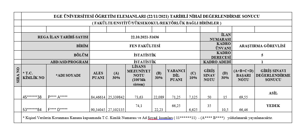 İstatistik Bölümü Araştırma Görevlisi Kadrosu Nihai Değerlendirme Sonucu Hk.