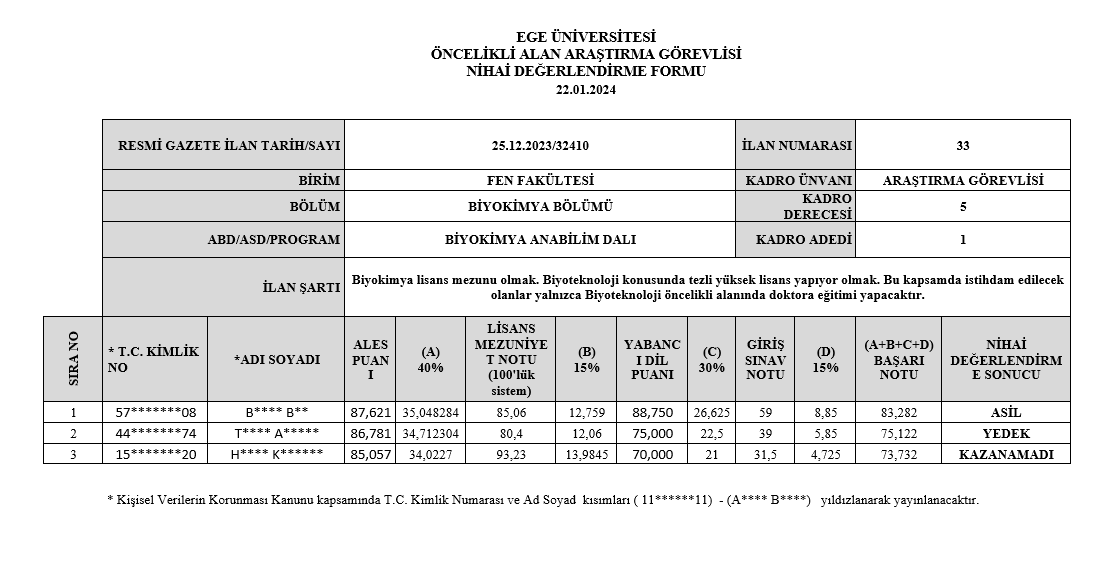 EGE ÜNİVERSİTESİ FEN FAKÜLTESİ BİYOKİMYA BÖLÜMÜ ÖĞRETİM ELEMANI (22/01/2024 ) TARİHLİ NİHAİ DEĞERLENDİRME SONUCU